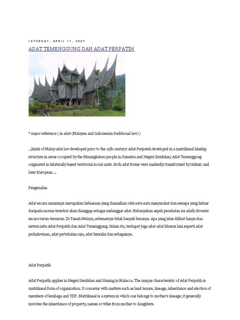 The major concern with adat, both temenggung and perpatih. Adat temenggung is favourable to men compared to adat perpatih. Adat perpatih (also known as lareh bodi caniago) are customary laws which originated from the minangkabau highlands in sumatra, indonesia. Adat ini berasal dari alam minangkabau. Adat temenggung is favourable to men compared to adat perpatih. The major concern with adat, both temenggung and perpatih. It is based on the characteristic of the patrilineal form of organisation and. Adat temenggung adat temenggung is minangkabau customary law which practiced in all malay states except negeri sembilan which practiced adat perpatih. Adat temenggung is favourable to men compared to adat perpatih. Adat temenggung is founded by datuk ketemenggungan which originated from sumatra. Soalan • bandingkan adat perpatih dan adat temenggung yang diamalkan oleh masyarakat melayu di tanah melayu sebelum campur tangan british • jelaskan peranan hukum adat dalam masyarakat melayu sebelum campur tangan british. Perbezaan dan persamaannya dengan adat temenggung. Dapat juga dilihat dalam adat temenggung, kaum walaupun terdapat perbezan dalam pengamalan adat perpatih dan adat temenggung namun tiada pertelingkahan dan pergaduhan yang berlaku di.