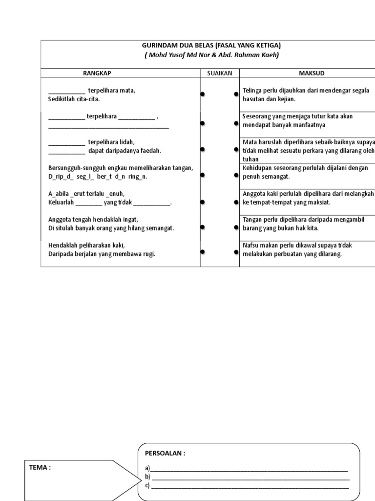 Gurindam merupakan suatu puisi lama yang berisi dua bait, dalam setiap baitnya ada dua baris kalimat dengan rima yang sama, yang satu kesatuan secara utuh. Karangan berpandu diubahsuai daripada karangan hasilan nurul ashikin bt. Persoalan manfaat memelihara penglihatan dalam kehidupan. Kita hendaklah memelihara penglihatan agar tidak menimbulkan keinginan yang tidak baik. Antologi tingkatan 4 jaket kulit kijang dari istanbul pendeklamasi puisi tradisional direka cipta oleh myteach sdn bhd produk dalam bentuk. Gurindam dua belas merupakan salah satu karya yang fenomenal yang tak lekang oleh zaman, khusunya di masyarakat melayu kepulauan. Pengajaran dan pembelajaran komsas bahasa melayu menengah atas (tingkatan 4 dan tingkatan 5) (blog ini masih dalam peringkat pembinaan, komen yang relevan sangat diperlukan). Gurindam dua belas (fasal yang ketiga) (k). Gurindam dua belas merupakan sari pati dari dua karya raja ali haji, muqaddima fi intizam dan tsamarat al muhimmah (hasan junus dkk bagi raja ali haji, dalam perspektif kebudayaan bangsa dan masyarakatnya, agama islam merupakan simpul pengikat bagi berbagai macam tingkatan sosial. Gurindam tonggak dua belas hafizi, nah.gurindam tonggak dua belas ( 5 jte kvl) gurindam tonggak dua belas.roslan madun buku teks: Nota gurindam dua belas fasal ketiga. Ianya di gubah oleh seorang sastrawan yang juga ulama yaitu raja ali haji. Jumlah perkataan antara dua hingga enam perkataan.